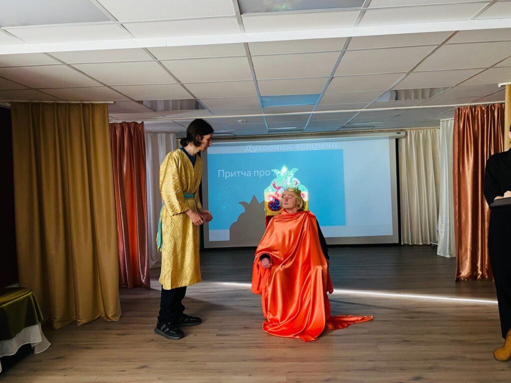 На встрече студенты БУ «РПК» представили инсценировку «Притча о богатстве». Посыл притчи был в том, что нельзя деньгам дать овладеть собой, сколько бы их у нас ни было, все материальные блага дал нам Бог.