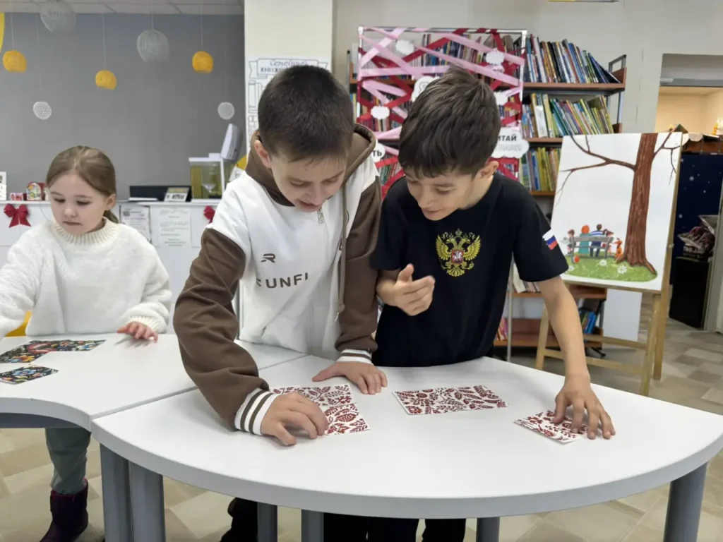 Дети с интересом рассматривали иллюстрации, узнавали о просторах нашей Родины, о том, как живут люди в разных уголках страны. Каждый попробовал себя в роли мастера — собирали фрагменты орнаментов, узнавая, что каждая линия и цвет у разных народов имеют свой смысл. Ребята вспомнили главные правила: помогать друг другу, уважать старших, говорить добрые слова и уметь прощать. Без этого никак не построить крепкий дом!