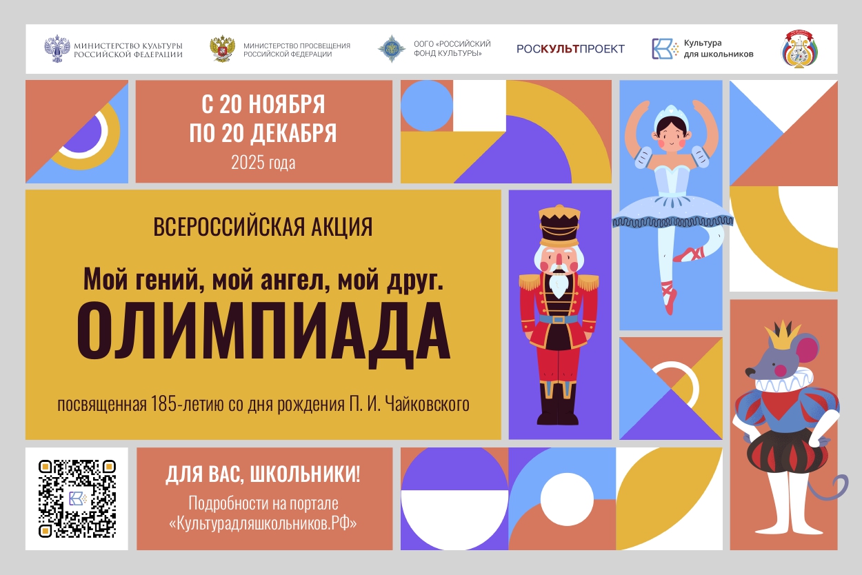 С 20 ноября по 20 декабря 2025 года в рамках межведомственного культурно-образовательного проекта «Культура для школьников» пройдет всероссийская акция «Мой гений, мой ангел, мой друг. Олимпиада», посвященная 185-летию со дня рождения величайшего русского композитора П.И. Чайковского.