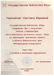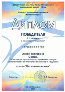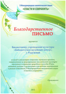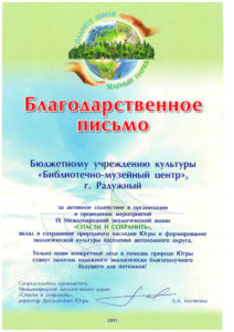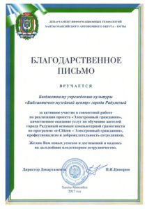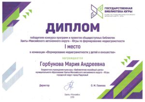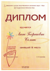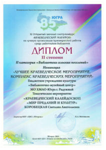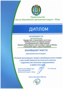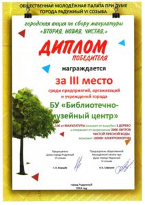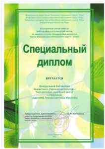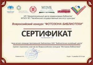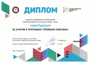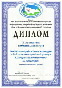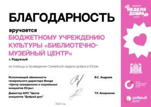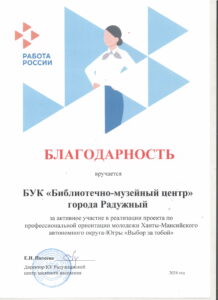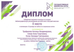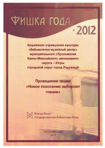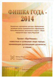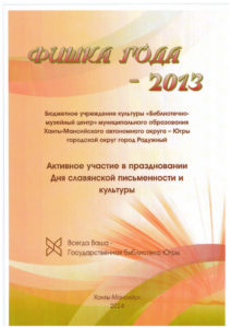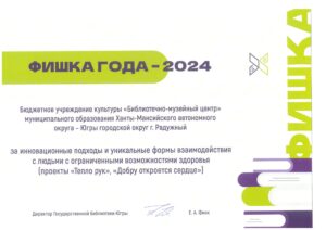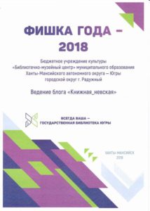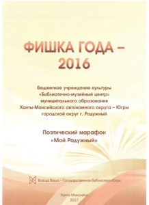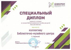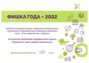 Достижения 2 ноября, 2020 10:35 дп Все202520242023202220212020201920182017201620152014201320122011201020092008200720062005 Фишка года 2024за инновационные подходы и уникальные формы взаимодействия с людьми с ограниченными возможностями здоровья (проекты «Тепло рук», «Добро откроется сердцу») БлагодарностьБУК «Библиотечно-музейный центр» города Радужный за активное участие в реализации проекта по профессиональной ориентации молодёжи Ханты-Мансийского автономного округа-Югры «Выбор за тобой» Фишка года 2023за инициативные проекты в области цифровизации библиотек Благодарственное письмокоманде БУК «Библиотечно-музейный центр» города Радужный за участие в квесте «Мы — славяне» в рамках кросскультурного диалога «Жить вместе, оставаясь разными» БлагодарностьБЮДЖЕТНОМУ УЧРЕЖДЕНИЮ КУЛЬТУРЫ «БИБЛИОТЧЕНО-МУЗЕЙНЫЙ ЦЕНТР» за помощь в проведении Семейной недели добра в Югре Фишка годаза успешную реализацию краеведческого проекта «Радужный в лицах: давайте знакомиться!» Фишка годаза успешную реализацию онлайн-проекта «Ни шагу назад!» Специальный дипломна лучшее библиографическое пособие для детей «Высший пилотаж» Дипломза участие в челлендже «Ожившая классика» Фишка годаФишка года 2020 ДипломI место в региональном конкурсе Лучшая организация, предоставляющая услуги людям с РАС ДипломДиплом 2019 I место Горбунова М. А. ДипломДиплом 2019 II место Ходырева В. Н. ДипломДиплом 2019 II место за работу Библиотеки Радужного — детям Фишка годаФишка года 2019 Благодарственное письмоБлагодарственное письмо от Департамента информационных технологий ХМАО-Югры за активное участие в совместной работе по реализации проекта “Электронный гражданин”, по программе “e-Citizen – Электронный гражданин”. Фишка годаФишка года за ведение блога “Книжная_невская” Фотозона библиотекиСертификат за участие в конкурсе «Фотозона библиотеки». ДипломIII место по городской акции по сбору макулатуры «Вторая. Новая. Чистая.» Фишка годаФишка года за проект “Неделя национальных культур”. ДипломДиплом участника городской акции по сбору макулатуры «Вторая. Новая. Чистая.» Благодарственное письмоБлагодарственное письмо-2017 0т ТИК г. Радужный Фишка годаФишка года за поэтический марафон “Мой Радужный”. Благодарственное письмоБлагодарственное письмо 2015 70-летие Победы в ВОВ ДипломДиплом 2015 2 место Краеведческий марафон Фишка годаФишка года 2015 Благодарственное письмоБлагодарственное письмо 2014 Стершонок Конда Фишка годаФишка года 2014 Благодарственное письмоБлагодарственное письмо 2013 Спасти и сохранить ДипломДиплом 2013 2 место Марш парков Фишка годаФишка года 2013 Благодарственное письмоБлагодарственное письмо 2012 Спасти и сохранить ДипломДиплом 2012 3 место От Избирком ХМАО ДипломСпециальный диплом 2012 Экологическое просвещение молодежи Фишка годаФишка года 2012 Благодарственное письмоБлагодарственное письмо 2011 Спасти и сохранить ДипломДиплом 2011 1 место Время молодых ДипломДиплом-2011 3 место Библиотекарь года Фишка годаФишка года 2011 Благодарственное письмоБлагодарственное письмо 2010 Спасти и сохранить Фишка годаФишка года 2010 Благодарственное письмоБлагодарственное письмо 2009 Спасти и сохранить Почётная грамотаПочетная грамота 2009 Спасти и сохранить Фишка годаФишка года 2009 Благодарственное письмоБлагодарственное письмо 2008 Повышение правовой культуры избирателей Благодарственное письмоБлагодарств