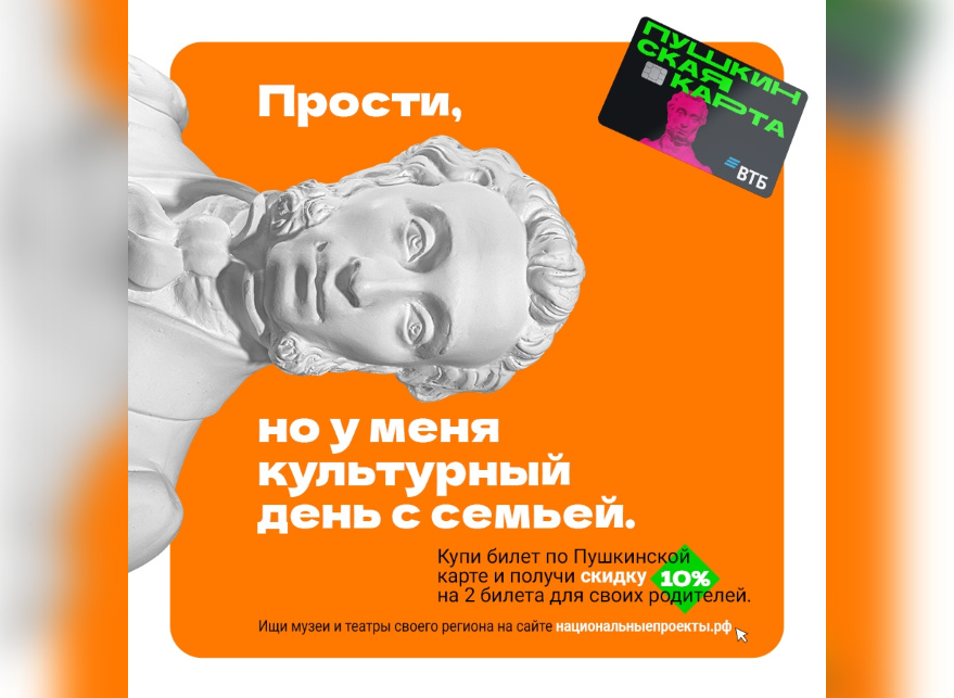 👉А это значит, что при покупке билета по Пушкинской карте вы можете приобрести два билета для родителей со скидкой 10%!